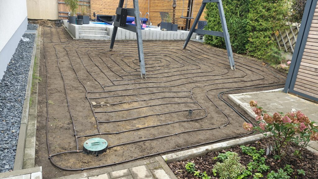 Automatische Bewässerung mit Versenkdüsen, Versenkregnern und Tropfrohr. Gräben mit Grabenfräse erstellt.